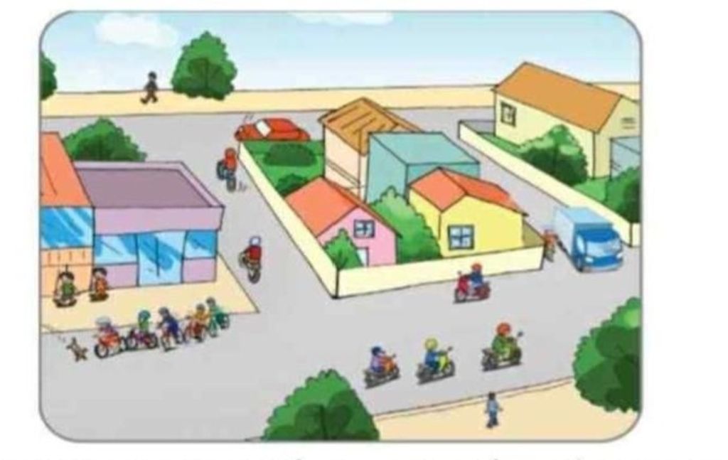 a) Xác định vị trí của người tham gia giao thông trong tranh sau đây. Phân tích các vị trí của người tham gia giao thông không an toàn trong tranh.