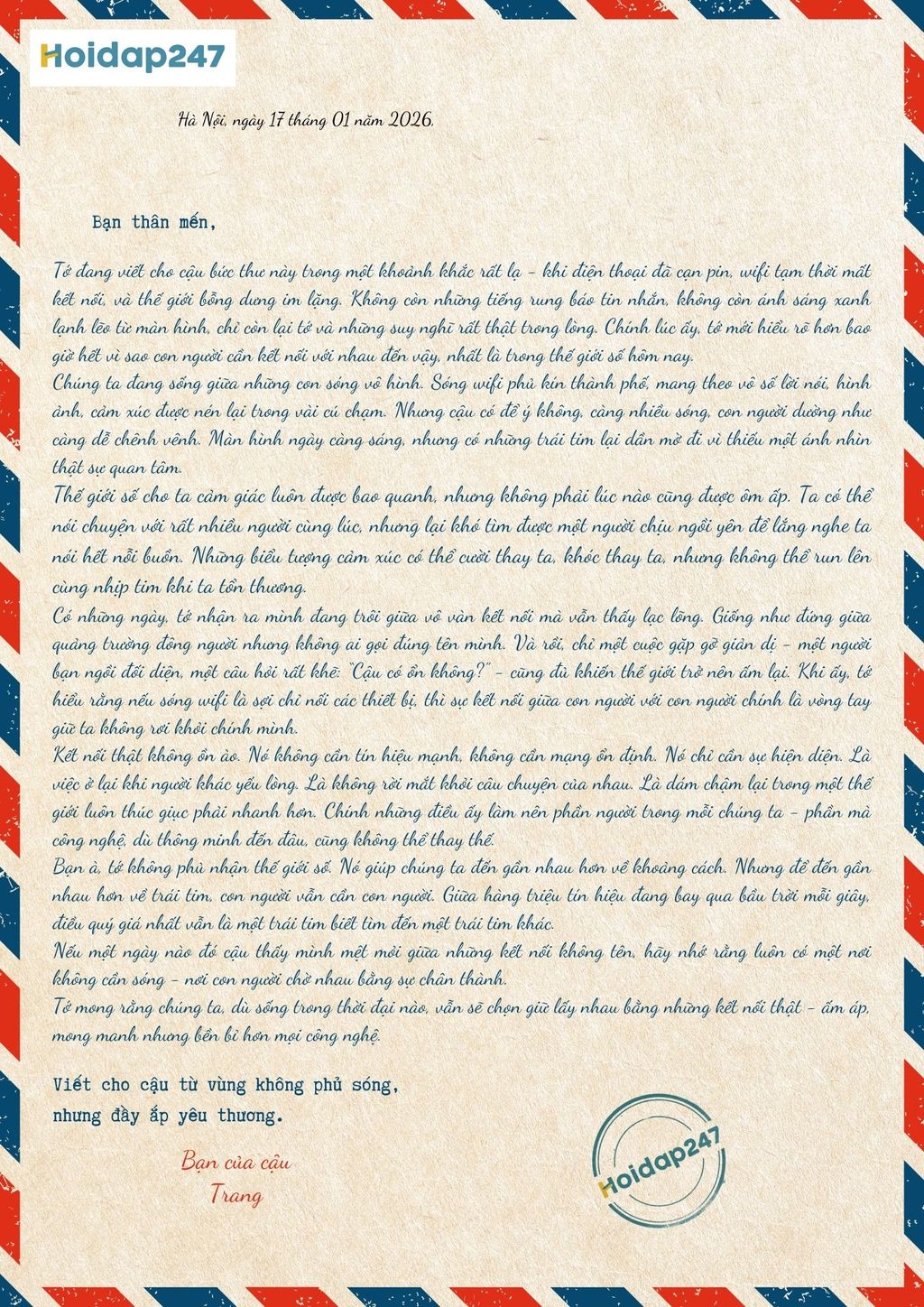 Mình viết thư cho cậu khi điện thoại vẫn đang rung lên từng hồi vì tin nhắn, thông báo, video mới. Lạ thật đấy, giữa hàng trăm kết nối chỉ bằng một cú chạm, mình lại thấy cần viết cho cậu một lá thư - chậm rãi và chân thành. Có lẽ vì trong thế giới số này, kết nối giữa người với người lại càng trở nên cần thiết hơn bao giờ hết.