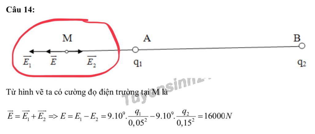Đối với E2: vì q2 < 0 nên điện trường của điện tích q2 tại một điểm nào đó ( cụ thể ở đây là M ) sẽ có chiều hướng về phía q2.