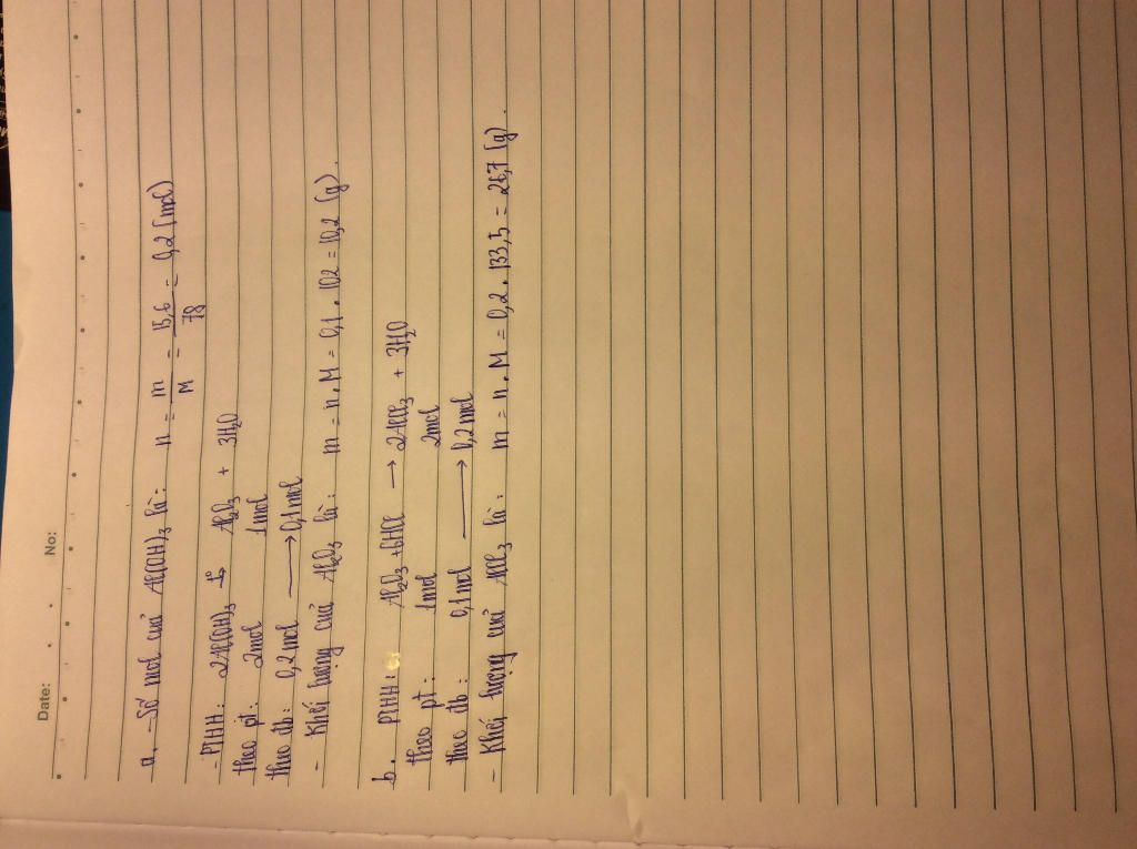 \(a,PTHH:2Al(OH)_3\xrightarrow{t^o} Al_2O_3+3H_2O\\ n_{Al(OH)_3}=\dfrac{15,6}{78}=0,2\ mol.\\ Theo\ pt:\ n_{Al_2O_3}=\dfrac{1}{2}n_{Al(OH)_3}=0,1\ mol.\\ ⇒m=m_{Al_2O_3}=0,1.102=10,2\ g.\\ b,PTHH:Al_2O_3+6HCl\to 2AlCl_3+3H_2O\\ Theo\ pt:\ n_{AlCl_3}=2n_{Al_2O_3}=0,2\ mol.\\ ⇒m_{AlCl_3}=0,2.133,5=26,7\ g.\)