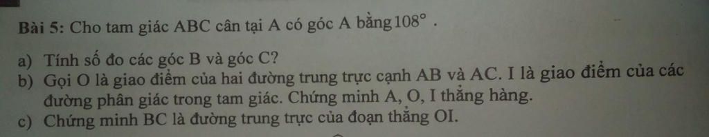 ⇒ $\widehat{ABO} = \widehat{BAO} = \dfrac{\widehat{BAC}}{2} = \dfrac{108}{2} = 54^o$