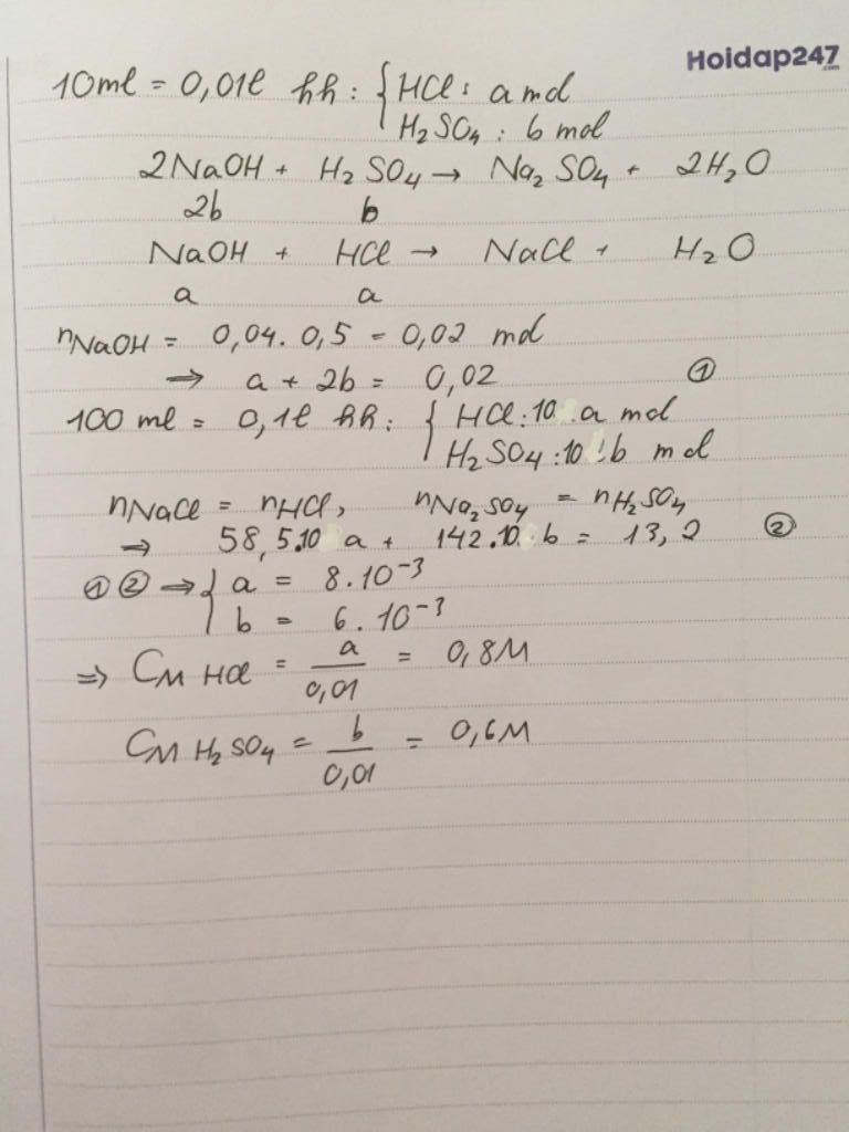 Vậy, $C_M HCl = 0,8M ; C_M H_2SO_4 = 0,6M$