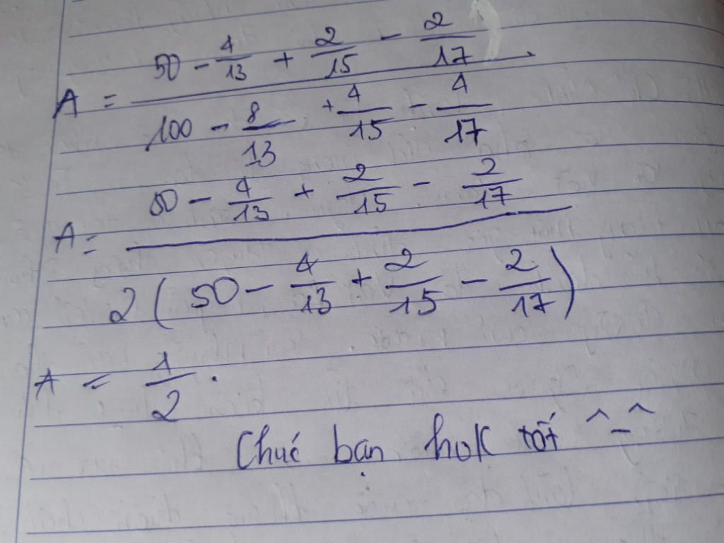 $\dfrac{50-\dfrac{4}{13}+\dfrac{2}{15}-\dfrac{2}{17}}{100-\dfrac{8}{13}+\dfrac{4}{15}-\dfrac{4}{17}}\\=\dfrac{\dfrac{165750-1020+442-390}{3315}}{\dfrac{331500-2040+884-780}{3315}}\\=\dfrac{164782}{3315}=\dfrac{164782}{329564}=\dfrac{1}{2}$