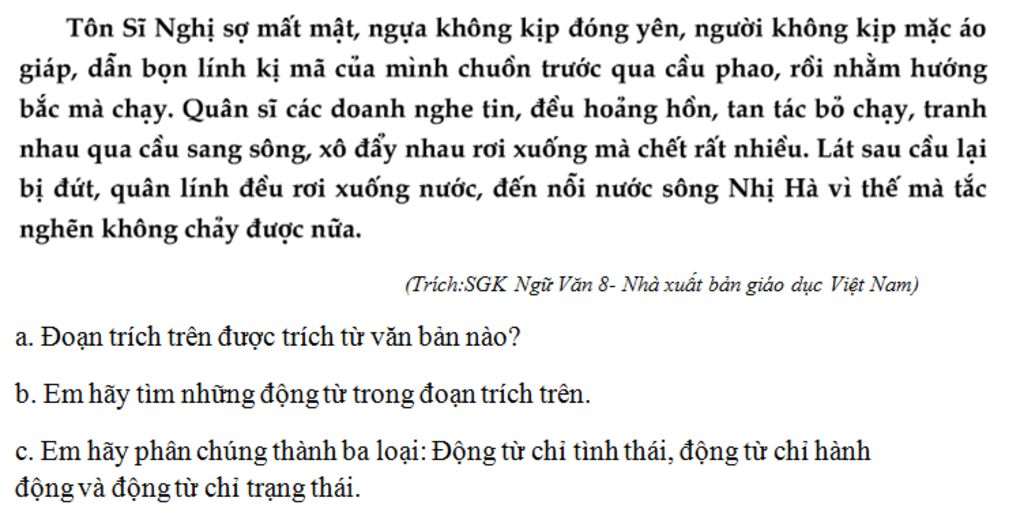 b/ - Những động từ là: sợ, đóng yên, mặc, dẫn, chuồn, nhằm, chạy, nghe, hoảng hốt, tan tác, tranh, sang, xô đẩy, rơi, chết, chảy.