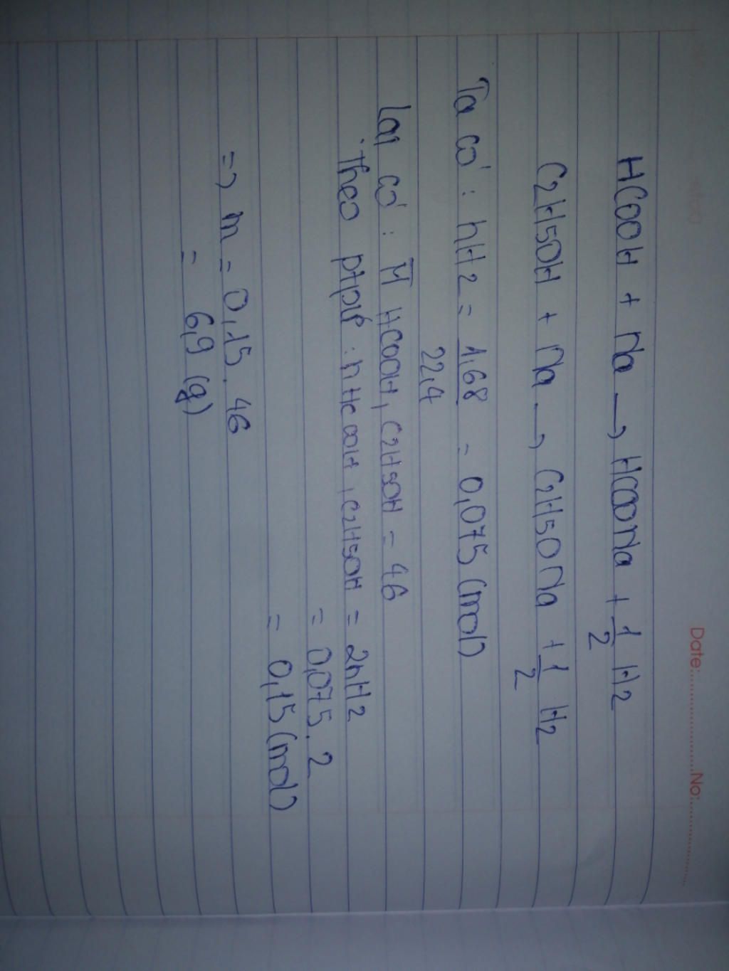 $n_{HCOOH} + n_{C_2H_5OH} = 2n_{H_2} = 0,075.2 = 0,15(mol)$