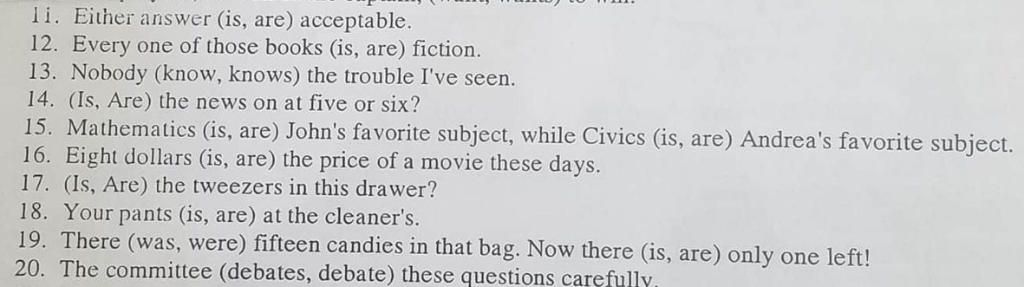 15. Mathematics (is, are) John's favorite subject, while Civics (is, are) Andrea's favorite subject.