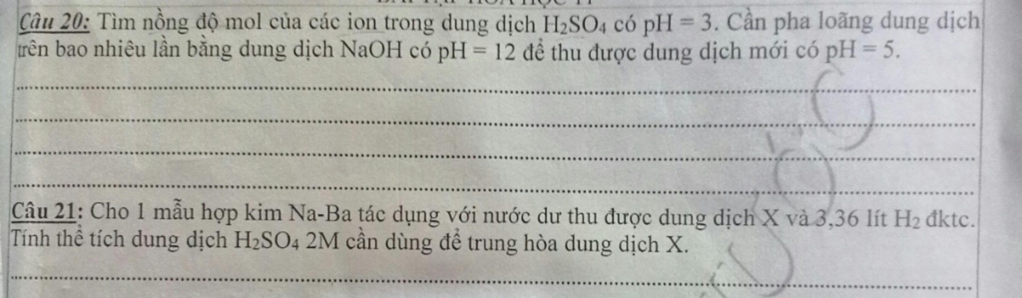 \( \to {n_{{H^ + }{\text{ dư}}}} = 0,001 - {10^{ - 2}}V\)