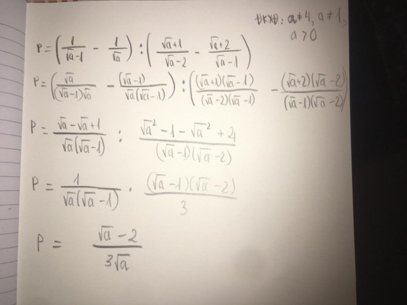 $⇒P=\dfrac{1}{\sqrt{a}.(\sqrt{a}-1)}.\dfrac{(\sqrt{a}-1)(\sqrt{a}-2)}{3}$