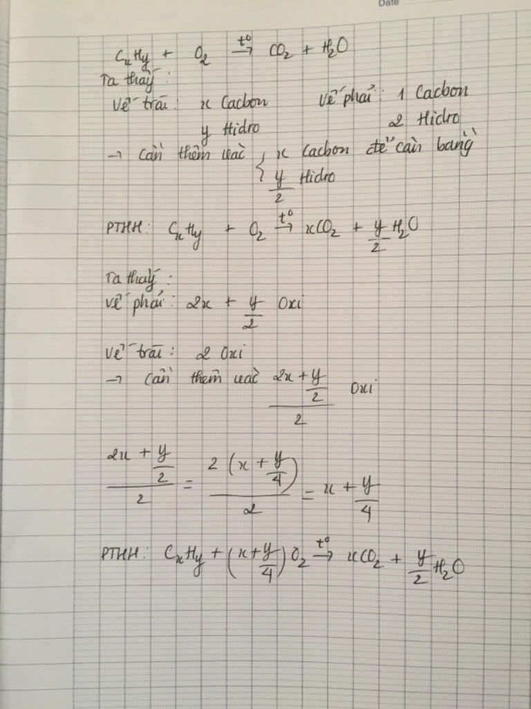 $C_xH_y + (x+ \dfrac{y}{4})O_2 \xrightarrow{t^o} xCO_2 + \dfrac{y}{2}H_2O$