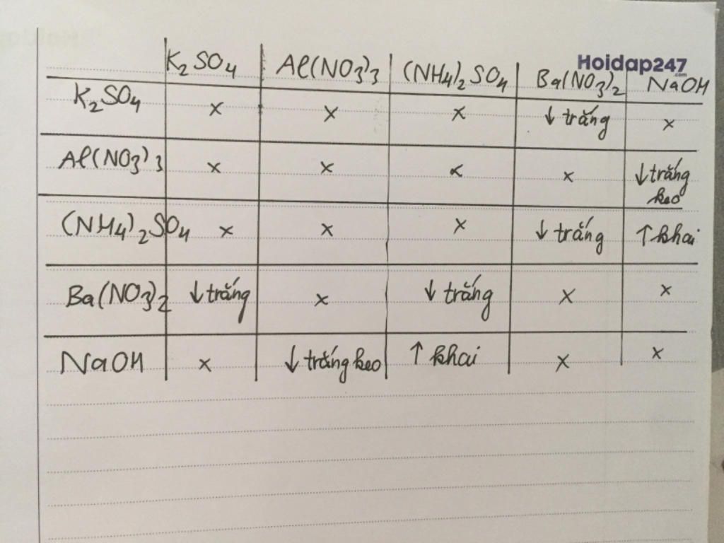 Trộn lần lượt các hoá chất theo các cặp. Bảng kết quả như hình: