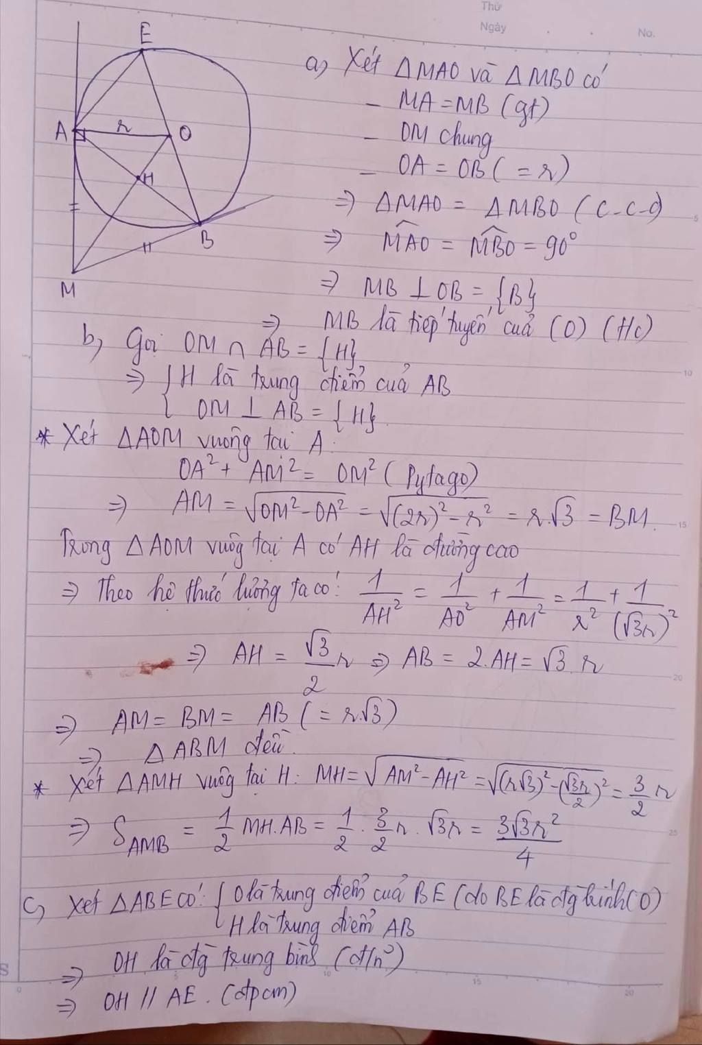 trên tiếp tuyến tại điểm A của đường tròn (O;R) lấy điểm M . gọi điểm b của đường tròn sao cho ma=mb . a, chứng minh mb là tiếp tuyến của đường tròn (O;R) . b, cho om = 2R chứng minh tam giác ABC đều . tính độ dài các cạnh và diện tích của tam giác AMB theo R . c, vẽ đường kính BE của (O) chứng minh AE// OM