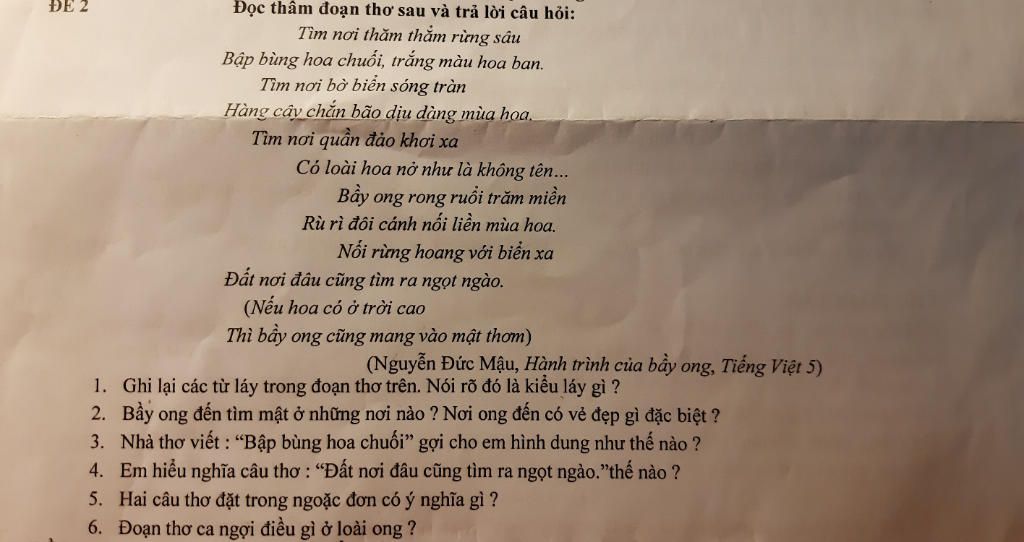 1. thăm thẳm là từ láy toàn bộ bập bùng, dịu dàng, rong ruổi, rù rì là từ láy phụ âm đầu 2. - Bầy ong đến tìm mật ở khắp nơi, rong ruổi trăm miền: ong có mặt nơi thăm thẳm rừng sâu, nơi bờ biển sóng tràn, nơi quần đảo khơi xa. Ong nối liền các mùa hoa, nối rừng hoang với đảo xa. Ong chăm chỉ, cần mẫn: giá hoa có ở trên trời cao thì bầy ong cũng dám bay lên để mang về mật thơm. - Vẻ đẹp của những nơi mà ong đến: nơi rừng sâu bập bùng hoa chuối, trắng màu hoa ban, biển xa có hàng cây chắn bão dịu dàng mùa hoa và nơi quần đảo có loài hoa nở như là không tên. 3. Trong bài thơ " Hành trình của bầy ong" tác giả viết " bập bùng hoa chuối" để nói lên vẻ đẹp của hoa chuối màu đỏ rực, hoa chuối - một ngọn nến sáng lấp lánh giữa khu rừng xanh sâu thẳm, không có ánh sáng, thắp sáng con đường cho bầy ong tìm đến. 4. Câu thơ “Đất nơi đâu cũng tìm ra ngọt ngào” có nghĩa là đến nơi nào, bầy ong chăm chỉ, giỏi giang cũng tìm được hoa để làm mật, đem lại hương ngọt ngào cho đời. 5. Dù hoa có ở trời cao thì vẫn chăm chỉ làm việc . 6. Đoạn thơ ca ngợi những phẩm chất đáng quý cùa bầy ong: cần cù làm việc có ích cho đời, tìm hoa gây mật, giữ hộ cho người những mùa hoa đã tàn phai, để lại hương thơm vị ngọt cho đời. Rút gọn1. thăm thẳm là từ láy toàn bộ bập bùng, dịu dàng, rong ruổi, rù rì là từ láy phụ âm đầu 2. - Bầy ong đến tìm mật ở khắp nơi, rong ruổi trăm miền: ong có mặt nơi thăm thẳm rừng sâu, nơi bờ biển sóng tràn, nơi quần đảo khơi xa. Ong nối liền các mùa h... xem thêm