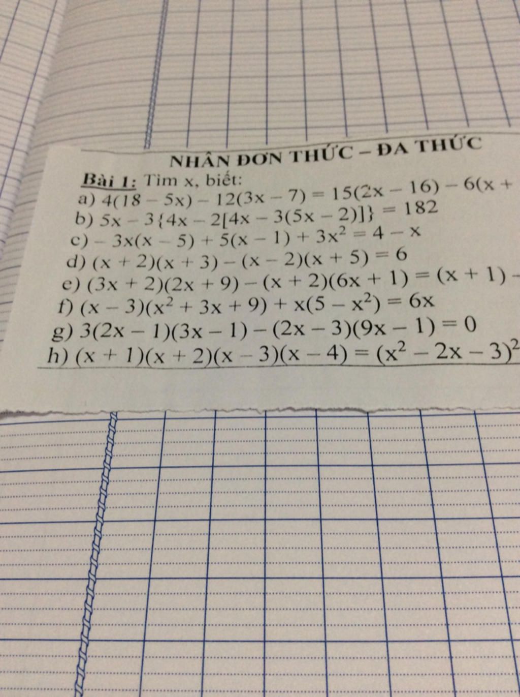 \(g,\ 3(2x-1)(3x-1)-(2x-3)(9x-1)=0\\ ⇔(6x-3)(3x-1)-(18x^{2}-29x+3)=0\\ ⇔18x^{2}-15x+3-18x^{2}+29x-3=0\\ ⇔(18x^{2}-18x^{2})+(-15x+29x)+(3-3)=0\\ ⇔14x=0\\ ⇔x=0\\ \text{Vậy x = 0}\\ h,\ (x+1)(x+2)(x-3)(x-4)=(x^{2}-2x-3)^{2}-5x^{2}\\ ⇔(x^{2}+3x+2)(x^{2}-7x+12)-(x^{2}-2x-3)^{2}+5x^{2}=0\\ ⇔(x^{4}-7x^{3}+12x^{2}+3x^{3}-21x^{2}+36x+2x^{2}-14x+24-x^{4}+2x^{3}+3x^{2}+2x^{3}-4x^{2}-6x+3x^{2}-6x-9+5x^{2}=0\\ ⇔(x^{4}-x^{4})+(-7x^{3}+3x^{3}+2x^{3}+2x^{3})+(12x{2}-21x^{2}+2x^{2}+3x^{2}-4x^{2}+3x^{2}+5x^{2})+(36x-14x-6x-6x)+(24-9)=0\\ ⇔10x+15=0\\ ⇔10x=(-15)\\ ⇔x=\dfrac{-15}{10}=\dfrac{-3}{2}\\ \text{Vậy $x=\dfrac{-3}{2}$}\)