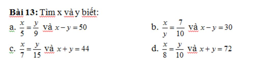 $\dfrac{x}{5} = \dfrac{y}{9} = \dfrac{x - y}{5 - 9} = \dfrac{50}{- 4} = - \dfrac{25}{2}$