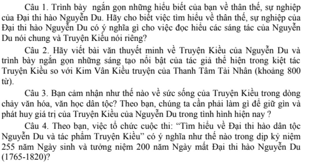 Nguyễn Du đc người đời mệnh danh là Đại thi hào bởi những tác phẩm văn học nổi tiếng mọi thời đại. Nhất là sức ảnh hưởng của ông qua tác phẩm Truyện Kiều đã dậy sóng lên những con tim hướng về vẻ đẹp của người phụ nữ và sự đồng cảm cuộc đời người phụ nữ thế hệ cũ. Ông mất nhưng tài năng và tác phẩm ông để lại trong tâm trí người con đất Việt. Ngày kỉ niệm sinh và mất của ông, việc tổ chức những cuộc thi tìm hiểu về ông và tác phẩm Truyện Kiều để những bạn trẻ biết, suy ngẫm và tìm hiểu những vẻ đẹp ấy. Và để nhân dân cùng hồi tưởng lại về hình ảnh và cuộc sống khổ cực ngày xưa.