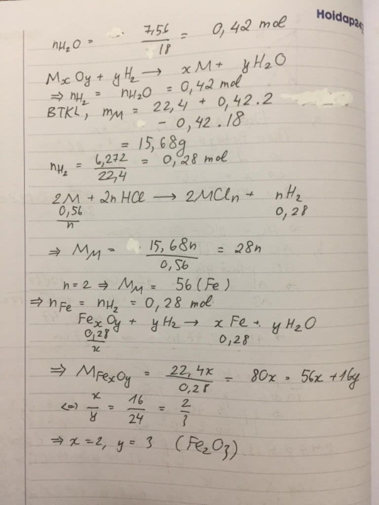 $n_{H_2} = n_{H_2O} = \dfrac{7,56}{18} = 0,42(mol)$