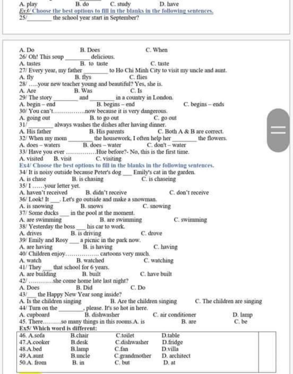 Er3/ Choose the best options to fill in the blanks in the following sentences.