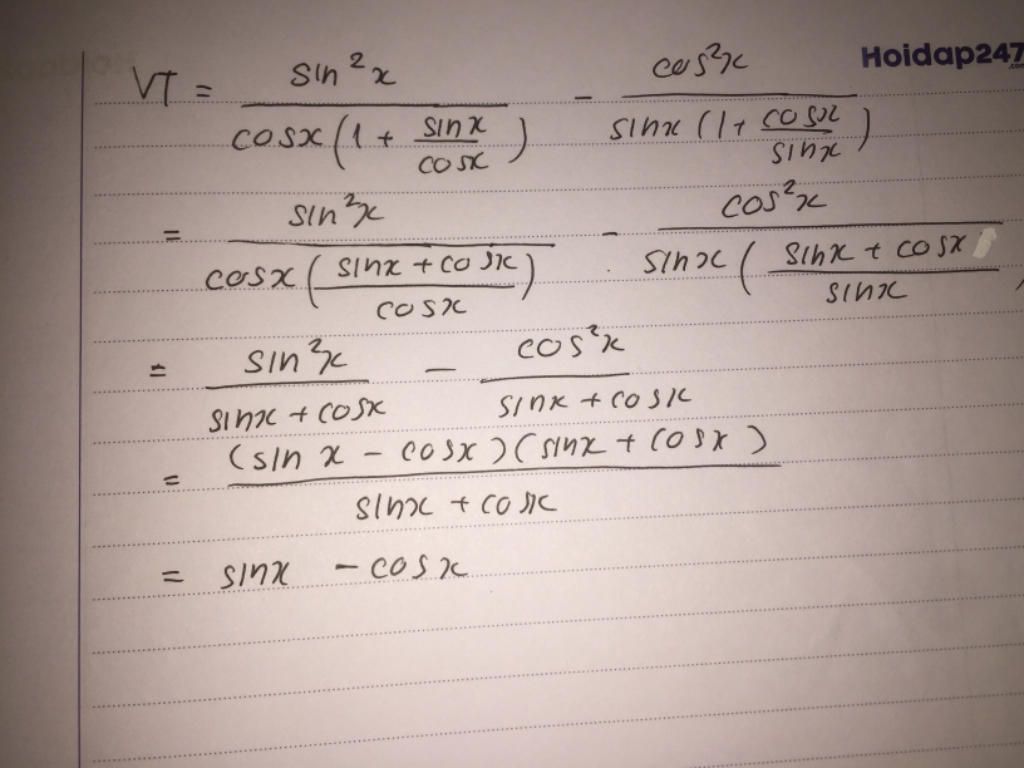 em làm đến đoạn sin^2/(cosx+sinx) - cos^2x/(sinx+cosx) thì làm j nữa ạ