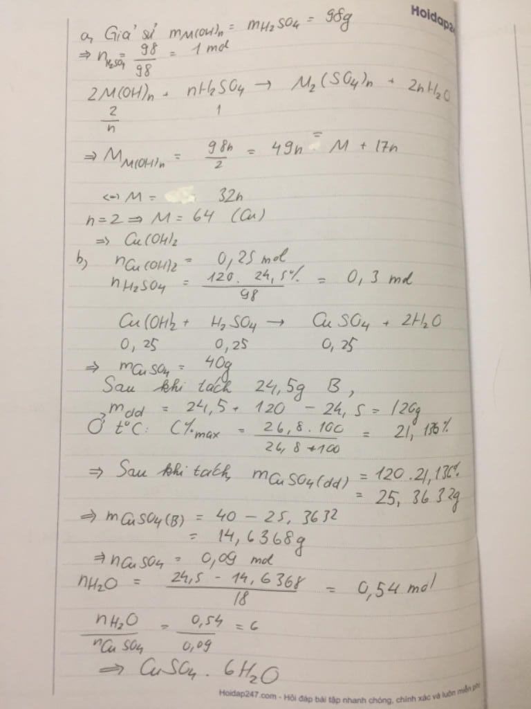 b)Hòa tan 24,5 hidroxit M(OH)n trên bằng 120 gam dung dịch H2So4 24,5% thu dung dịch A.Làm lạnh dung dịch A xuống t độ C thấy tách ra 24,5g kết tủa B là 1 muối ngậm nước,dung dịch còn lại trong đó có CuSo4 với độ tan ở t độ C là 26,8.Tìm công thức của B