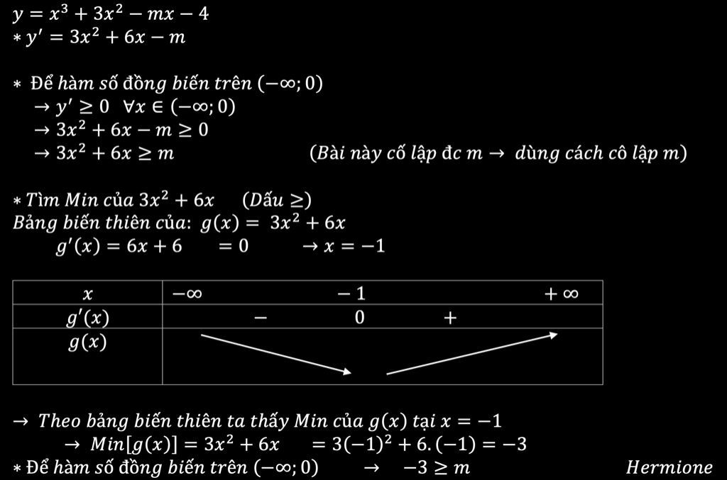 Cô lập m khi m tách được ra khỏi cái biểu thức đó: VD như bài trên còn 2mx^2+2mx-3m thì không cố lập được khi đấy mình xét đến delta * Xét delta thì cũng phải xem hệ số a ( hệ số đầu của mũ lớn nhất) có chứa m không nếu có lại phải xét a=0 và a/=0 * Nếu đề bảo đồng biến hoặc nghịch biến trên R thì xét delta nhỏ hơn 0 ( xem cả a nữa) * Không thể xét delta nhỏ hơn 0 khi mà đề bài bảo đb hoặc nb trong 1 đoạn có độ dài = bao nhiêu đó thì phải tìm ra x1 và x2 rồi áp trong trái ngoài cùng vào Rút gọnCô lập m khi m tách được ra khỏi cái biểu thức đó: VD như bài trên còn 2mx^2+2mx-3m thì không cố lập được khi đấy mình xét đến delta * Xét delta thì cũng phải xem hệ số a ( hệ số đầu của mũ lớn nhất) có chứa m không nếu có lại phải xét a=0 và a/=0 * Nế... xem thêm