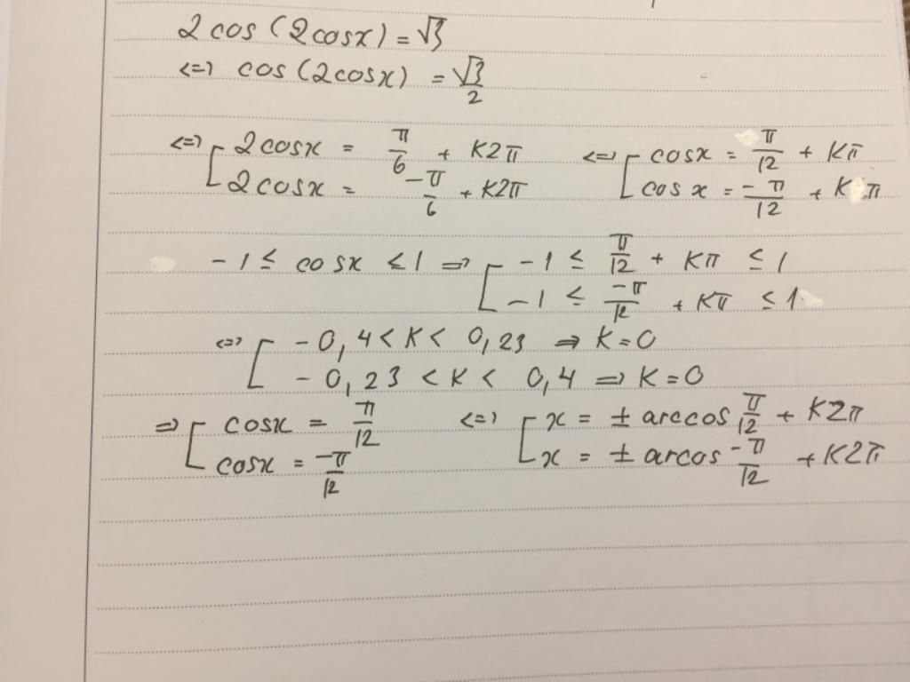 $\Leftrightarrow cos(2cosx) = cos\dfrac{\pi}{6}$