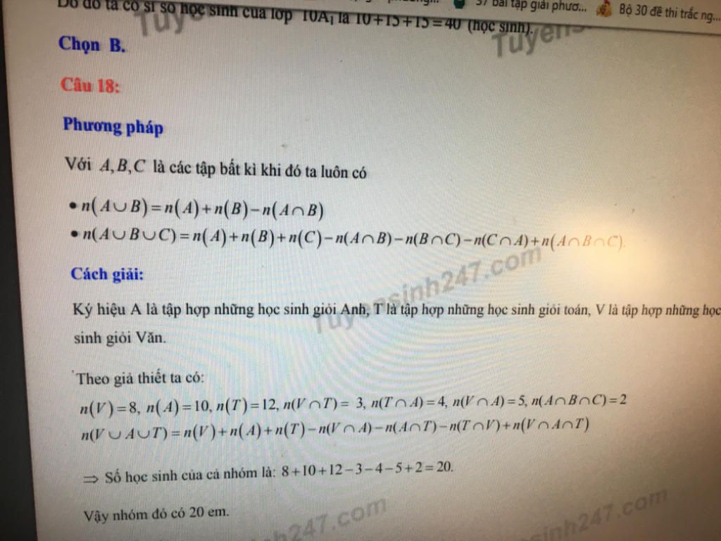 Giải thích: Khi trừ đi phần giao nhau giữa 2 môn, ta vô tình trừ đi phần giao nhau cả 3 môn nên ta phải cộng thêm vào sau khi loại đi số học sinh giỏi hai môn.