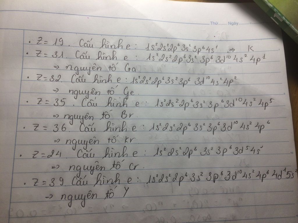 Z = 19 => cấu hình e là : $1S^{2}$$2S^{2}$$2P^{6}$$3S^{2}$$3P^{6}$$4S^{1}$ => Nguyên tố ở ô số 19 chu kì 4 nhóm IA => Kali
