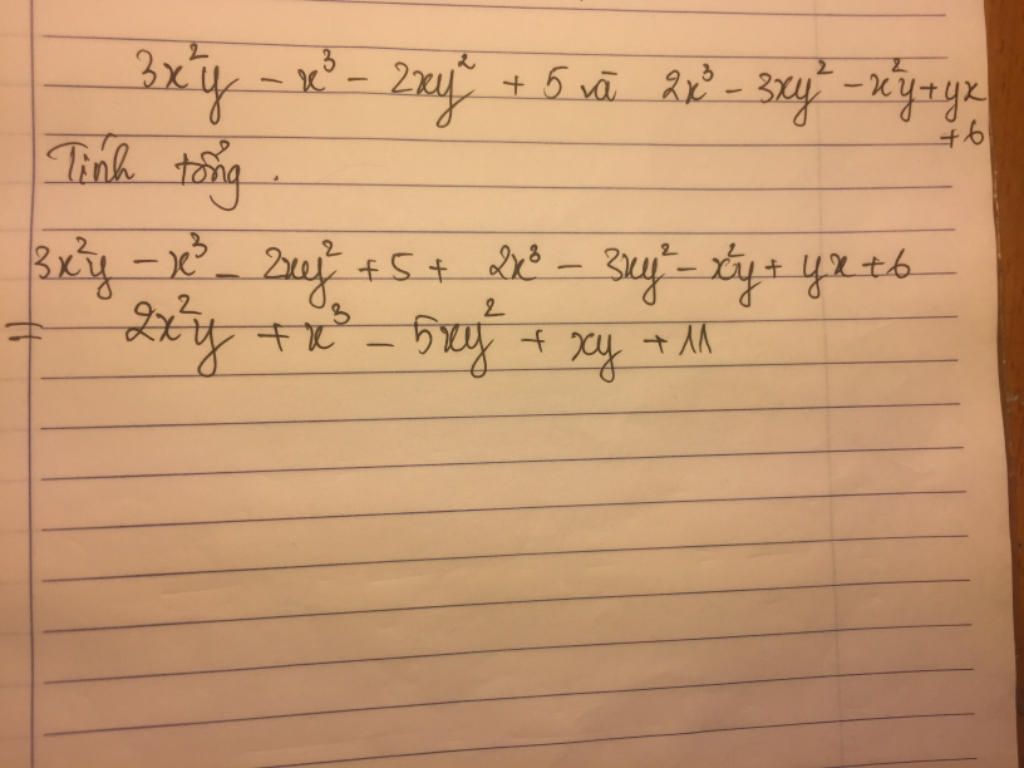 (3x^2y-3x-2xy^2+5)+(2x^3-3xy^2-x^2y+xy+6)