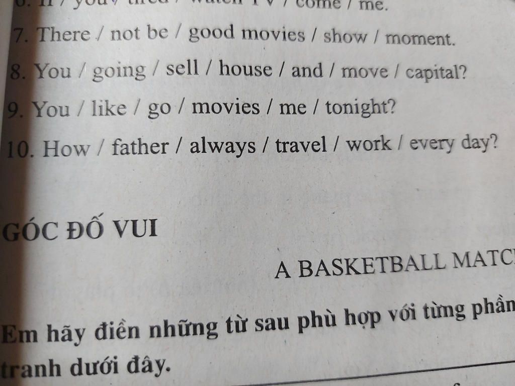 7.there isn't good movies to show at the monent 8.Are you going to sell the house and move to the captital. 9.Will you like going movies with me tonight. 10.How does your father always travel to work every day. xin câu trả lời hay nhất