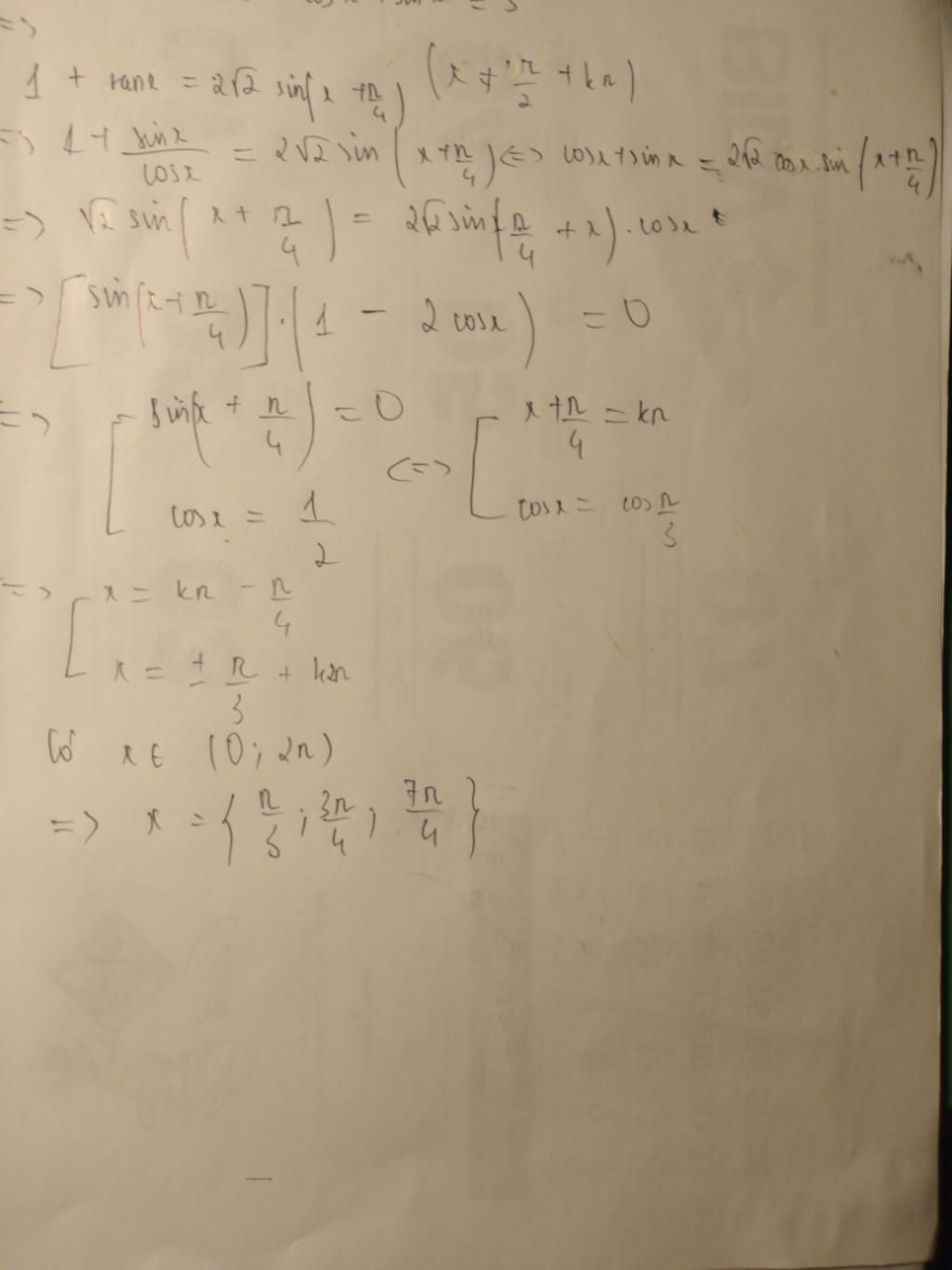$1 + tanx = 2\sqrt{2}.sin(x+\dfrac{\pi}{4})\,\,\,\,\, (ĐK: \, x \ne \dfrac{\pi}{2} + k\pi)\\ \Leftrightarrow \dfrac{cosx+six}{cosx} = 2\sqrt{2}.sin(x+\dfrac{\pi}{4})\\ \Leftrightarrow cosx + sinx = 2\sqrt{2}.cosx.sin(x+\dfrac{\pi}{4})\\ \Leftrightarrow \sqrt{2}sin(x+\dfrac{\pi}{4}) = 2\sqrt{2}cosx.sin(x+\dfrac{\pi}{4})\\ \Leftrightarrow sin(x+\dfrac{\pi}{4})(2cosx -1)=0\\ \Leftrightarrow \left[\begin{array}{l}sin(x+\dfrac{\pi}{4}) = 0\\cosx = \dfrac{1}{2}\end{array}\right.\\ \Leftrightarrow \left[ \begin{array}{l}x = -\dfrac{\pi}{4} + k\pi\\x=\dfrac{\pi}{3}+k2\pi\\x=-\dfrac{\pi}{3} + k2\pi\end{array} \right.\,\,\,(k\in \Bbb Z)$