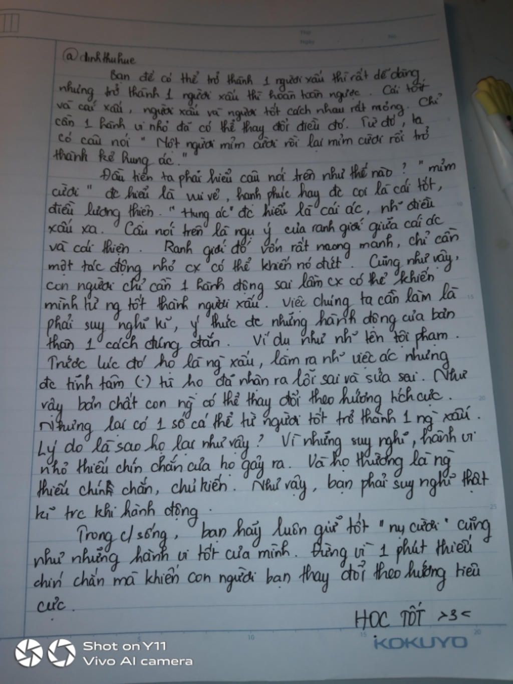 Trên đời này ko ai sinh ra bản chất sẽ tốt hay xấu bẩm sinh cả , do điều kiện môi trường sinh sống và do chính bản thân họ vô tình đi vào con đường tọi lỗi . Chỉ cần từ 1 hành động nhỏ nhất cũng có thể để lại hậu quả nặng nề , chỉ cần 1 vc làm xấu cũng sẽ biến chúng ta trở thành kẻ ác . Ko nên thờ ơ trc 1 vc làm xấu vì sự thờ ơ có thể khiến vc làm xấu trở nên khó lường đc hậu quả . Ko có con đường nào là ko có lối đi trở lại "Người ta đánh kẻ chạy đi chứ ko ai đánh người chạy lại" , luôn có cơ hội cho những người phạm phải những sai lầm .Và chúng ta cũng nên nhớ rằng dù chúng ta ko làm vc xấu nhưng nếu chúng ta thờ ơ trc những vc lm vô lương tâm ấy thì chính chúng ta cũng đáng bị lên án . Dừng baoh trách người khác vô tâm nếu mk ko biết quan tâm .