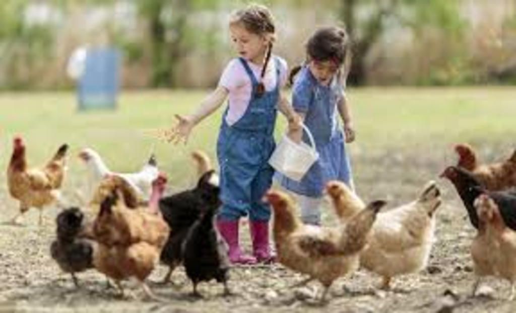 Trong bức tranh, tôi thấy có hai bé gái cùng một bầy gà. Họ đang cùng nhau cho những chứ gà ăn vì tôi thấy họ đang cầm một cái xô và bên trong chắc hẳn là một ít cám. Cô bé thứ nhất có hai cái bím tóc trông thật xinh xắn, cô bé mặc một chiếc quần yếm bò với một chiếc áo trắng và đi một đôi ủng có màu tím nhạt. Cô bé gái đứng cạnh cô bé chắc là bạn hoặc chị em của cô bé. Bé gái này có một chiếc váy bò trông thật đáng yêu, cô bé đang loay hoay bốc cám cho gà ăn. Xung quanh họ là những chú gà to béo nhìn như những cục bông. Mỗi con lại có một màu sắc khác nhau, con màu vàng đất, con màu vàng trắng, con màu nâu nâu và có cả con màu đen. Hai cô bé này rải cám đến đâu là những chú gà này lại đi đến đó để được ăn. Những chứ gà dùng cái mỏ nhọn đi xung quanh các cô rồi mổ xuống đất để nhặt cám ăn. Có vài chú gà thì đang cùng nhau đi dạo, không cần ăn. Gần chỗ đó tôi thấy có một bãi cỏ xanh, và xa hơn chút là có một hàng rào cùng một vài cây xanh.