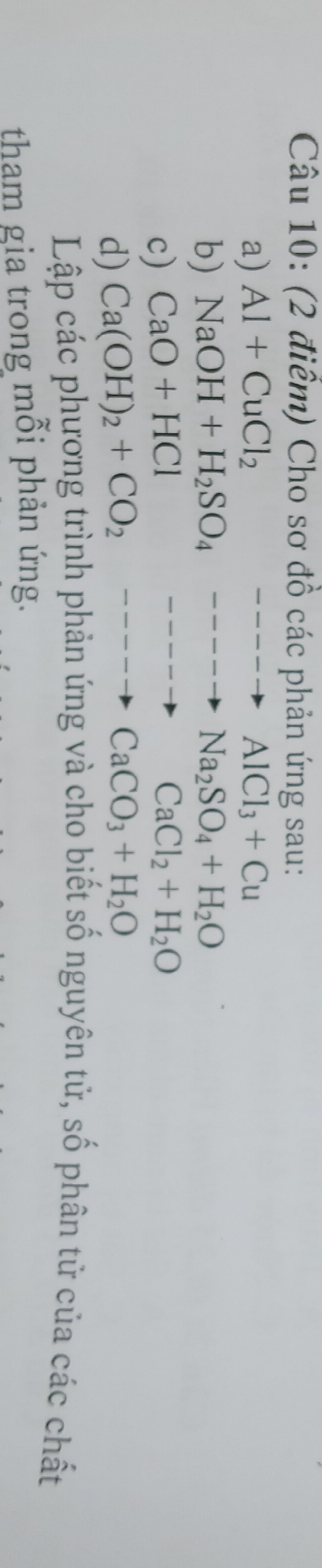 Đáp án: 2Al+3CuCl2 ---->2ALCL3+3Cu