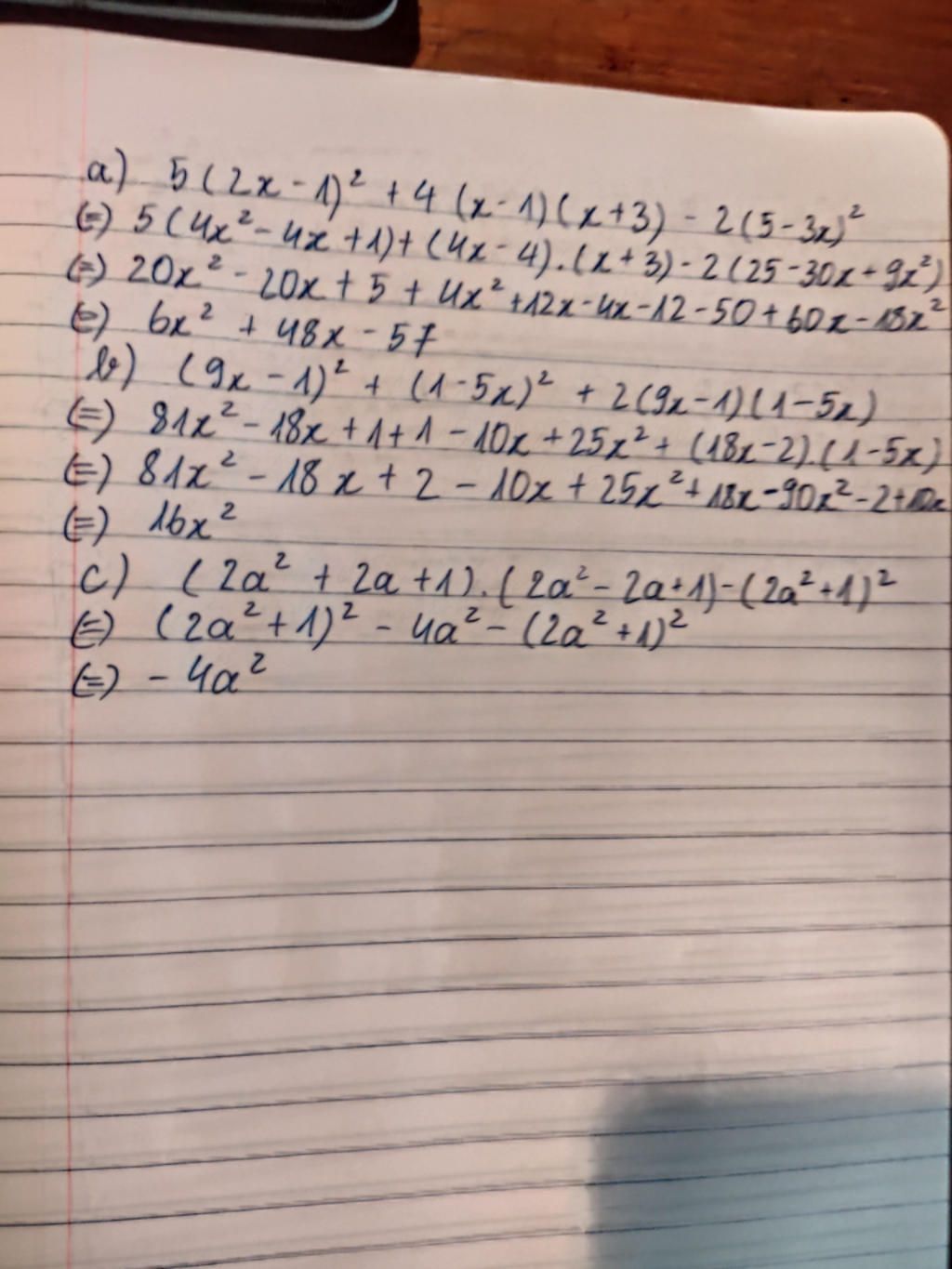 c) (2a² + 2a + 1)(2a² - 2a + 1) - (2a² + 1)²