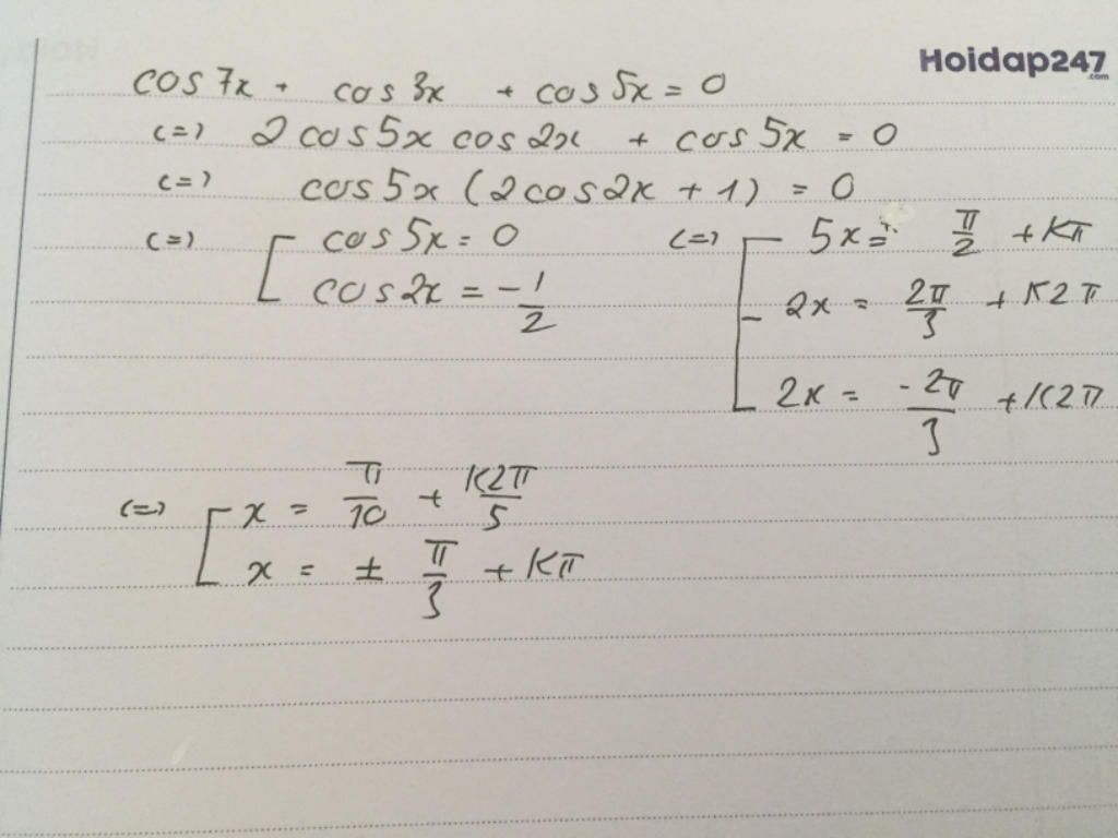 `<=>` \(\left[ \begin{array}{l}cos5x=0\\cos2x=\dfrac{-1}{2}\end{array} \right.\)