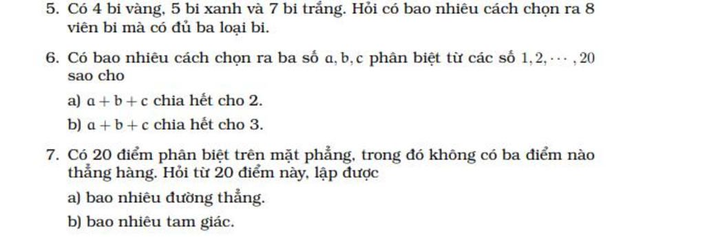 bài 7 : Mỗi tập hợp con gồm 3 điểm (ko phân biệt thứ tự) của tập hợp có 6 điểm đã cho xác ddinhhj duy nhất 1 tam giác . Từ đó ta có số tam giác có thể lập đc là :