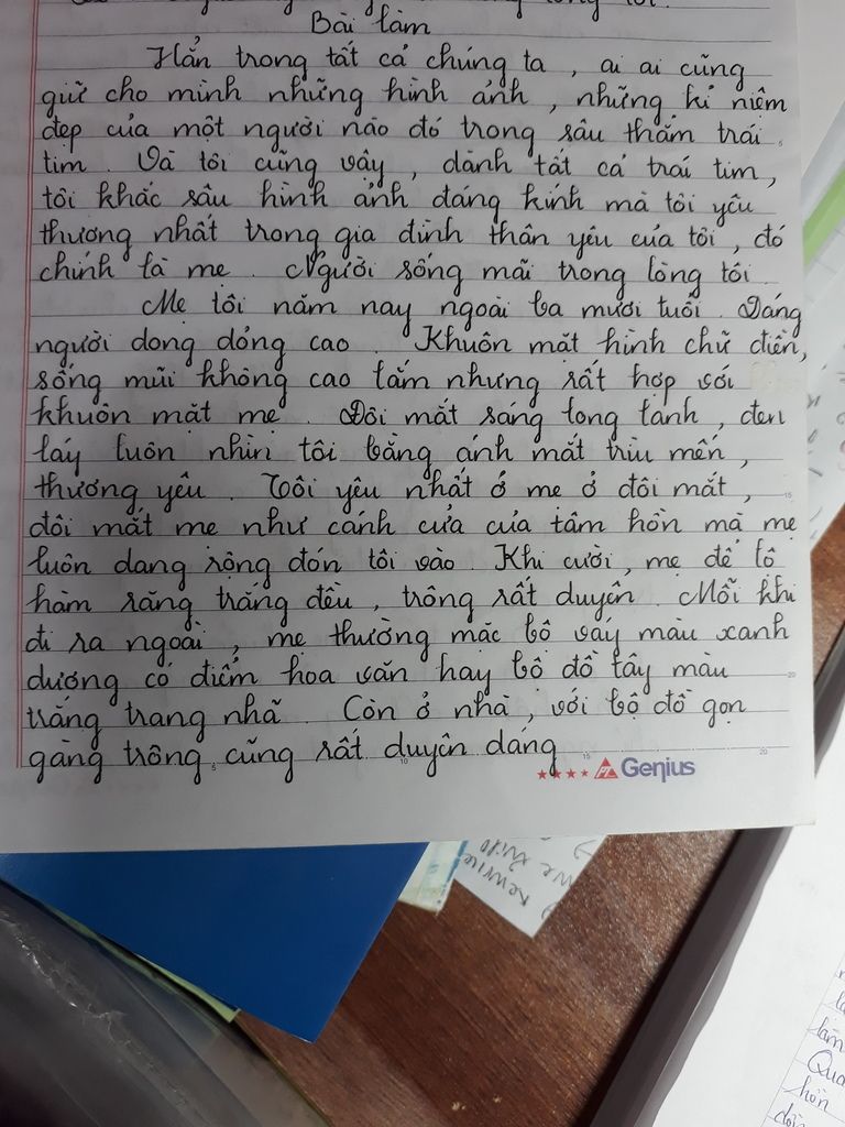 Trong vũ trụ này có rất nhiều cái đẹp, nào là ngôi sao, nào là các hành tinh lấp lánh. Nhưng vẫn soi sáng, lấp lánh nhất chính là người mẹ trên trái đất này. Mẹ là người mà tôi luôn tự hào nhất, tự hỏi mẹ làm bằng gì mà dịu dàng, hiền hậu, tốt bụng. Ngây thơ như vậy mẹ tôi không thương tôi mới lạ. Mẹ ngày nào cũng khuyên tôi học bài, làm bài, nếu có bài không hiểu thì hỏi mẹ. Mẹ giống như một cuốn sách giáo án để "chép" bài, để soạn bài vậy. Người không thể thiếu trong gia đình này, mẹ chính là người ở vị trí cao nhất trong lòng tôi.