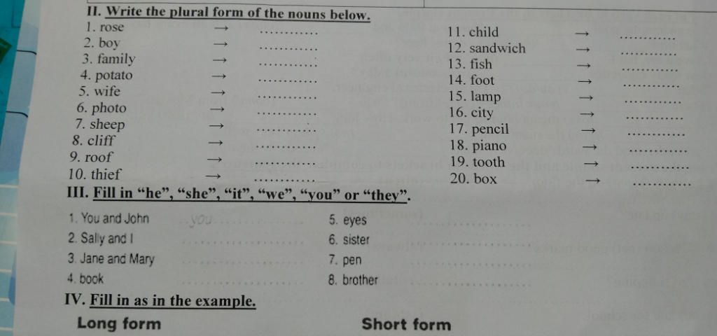 1 roses 2 boys 3 families 4 potatos 5 wifes 6 photos 7 sheep 8 cliffs 9 roofs 10 thieves 11 children 12 sandwiches 13 fish 14 feet 15 lamps 16 cities 17 pencils 18 pianos 19 teeth 20 boxes III 1 they 2 we 3 they 4 it 5 it 6 she 7 it 8 he