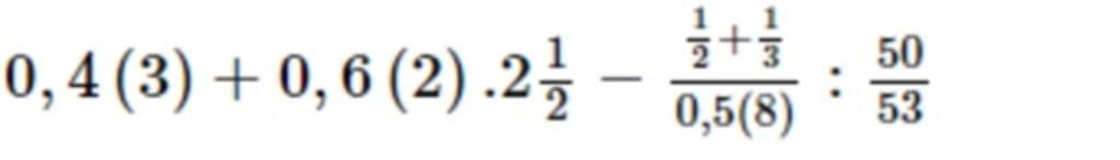 \(0,4(3)+0,6(2).2\frac{1}{2}-\frac{\frac{1}{2}+\frac{1}{3}}{0,5(8)}:\frac{50}{53}\)