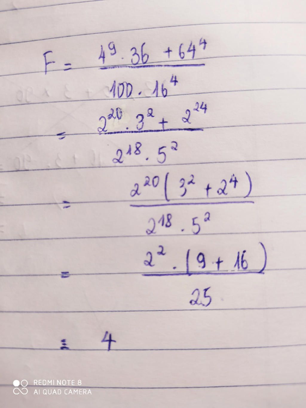 $F = \dfrac{4^9. 36 + 64^4}{100 . 16^4}$