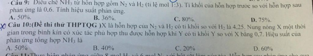 - Câu 9: Điều chế NH3 từ hôn hợp gồm N2 và H2 (ti lệ mol T:3). Ti khối của hỗn hợp trước so với hôn hợp sau