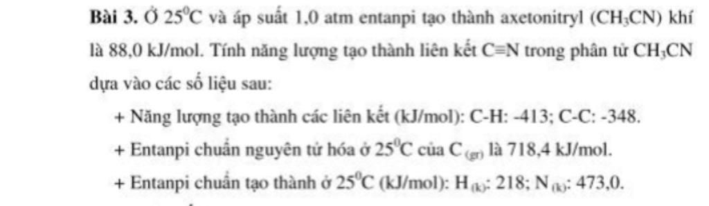 Bài 3. Ở 25°C và áp suất 1,0 atm entanpi tạo thành axetonitryl (CH,CN) khí