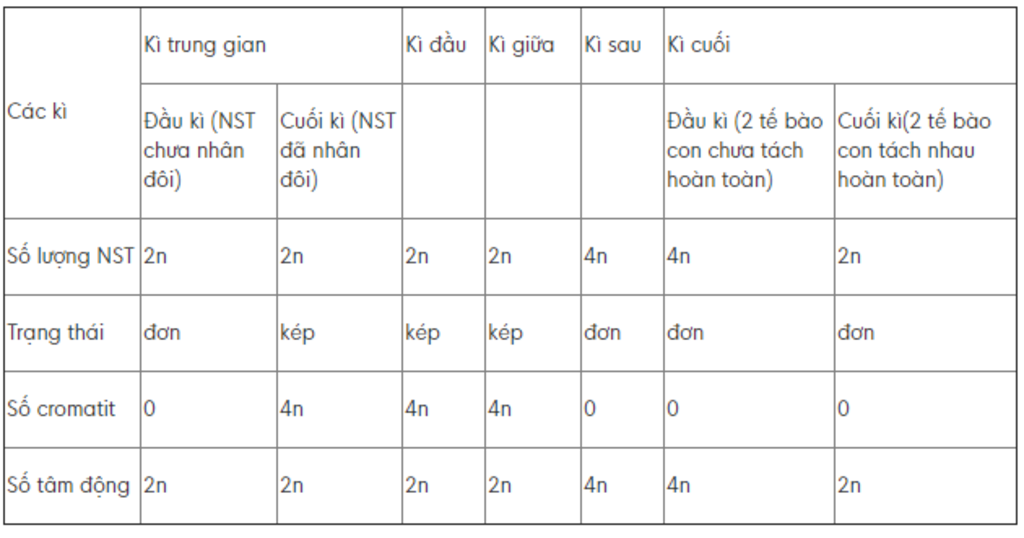 - Kì trung gian: lúc đầu NST tồn tại ở dạng sợi đơn và duỗi xoắn. NST tự nhân đôi ở pha S để tạo ra NST ở trạng thái kép. Trung thể tự nhân đôi để tạo ra 2 trung thể và chúng di chuyển dần về 2 cực của tế bào.