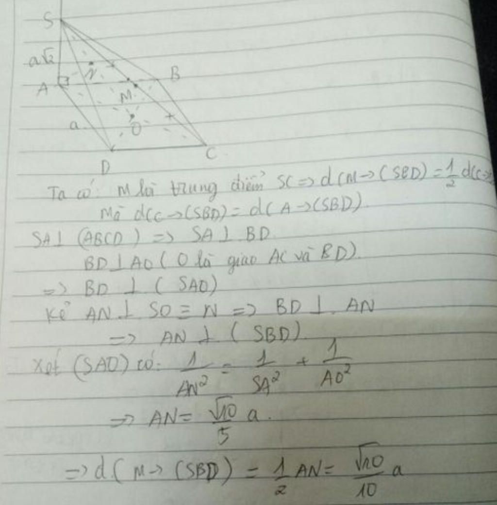 Vậy khoảng cách từ $M$ đến $(SBD)$ bằng $\dfrac{a\sqrt[]{10}}{10}$.