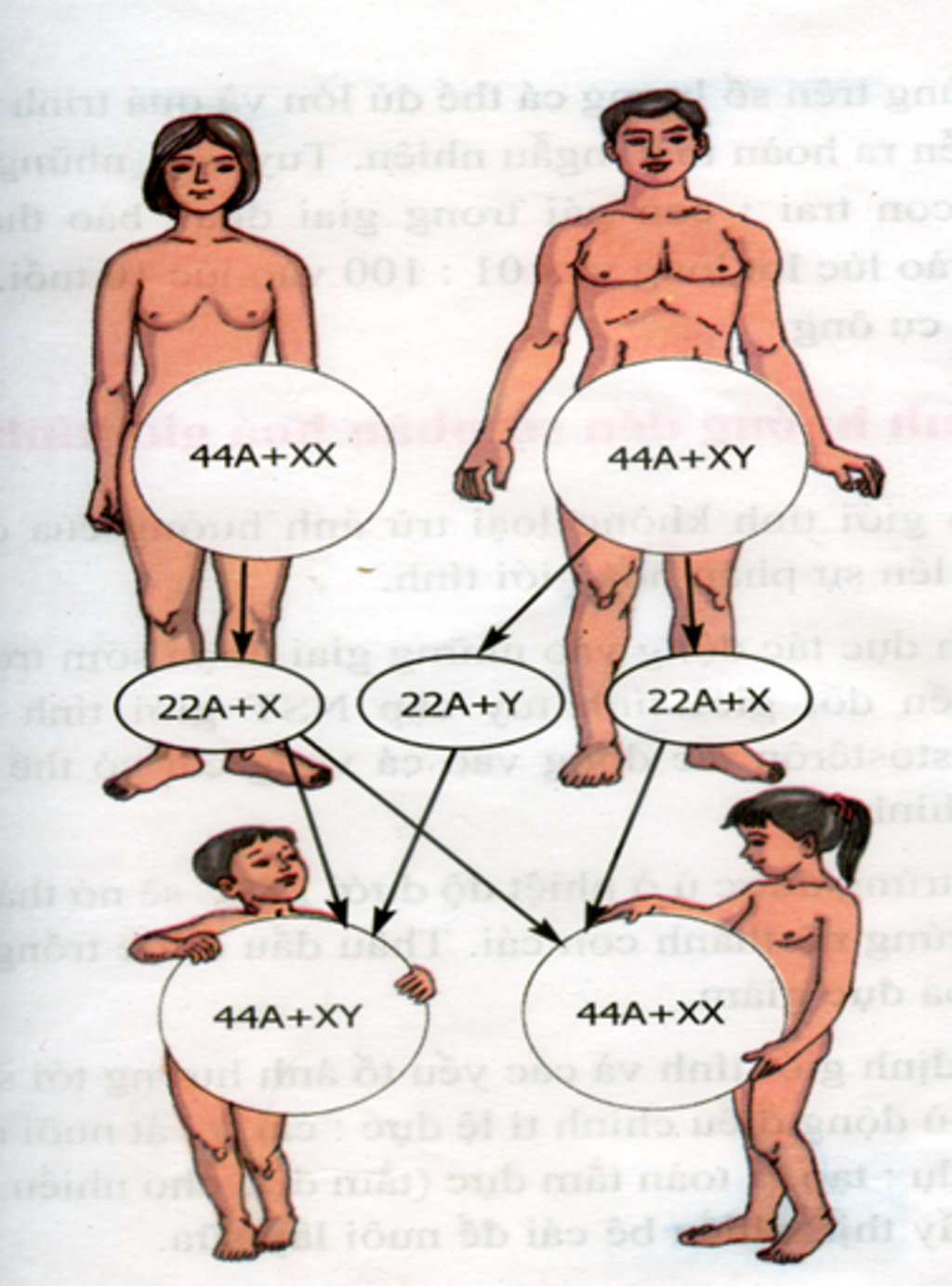 Qua giảm phân ở mẹ sinh ra một loại trứng 22A + X, còn ở bố cho ra 2 loại tinh trùng là 22A + Y; 22A + X