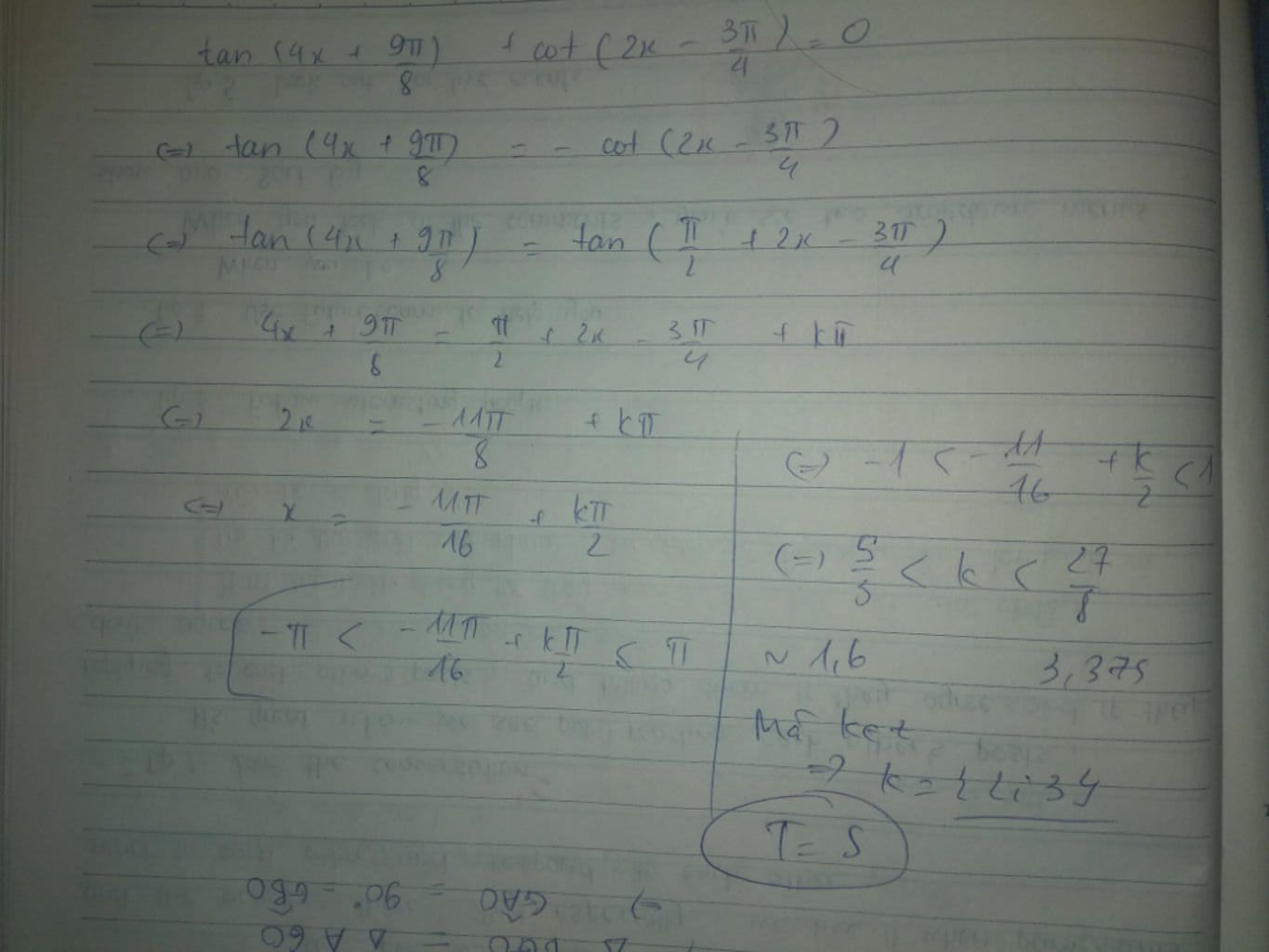 \Leftrightarrow -\pi < -\dfrac{11\pi}{16} + k\dfrac{\pi}{2} < \pi\\