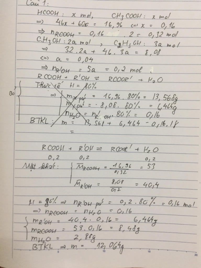 Hỗn hợp X gồm HCOOH, CH3COOH (tỉ lệ mol 1:1), hỗn hợp Y gồm CH3OH, C2H5OH (tỉ lệ mol 2:3). Lấy 16,96 gam hỗn hợp X tác dụng với 8,08 gam hỗn hợp Y (có xúc tác H2SO4 đặc) thu được m gam este (hiệu suất các phản ứng este hóa đều bằng 80%). Giá trị của m là: (ĐÁP ÁN 12,064g)