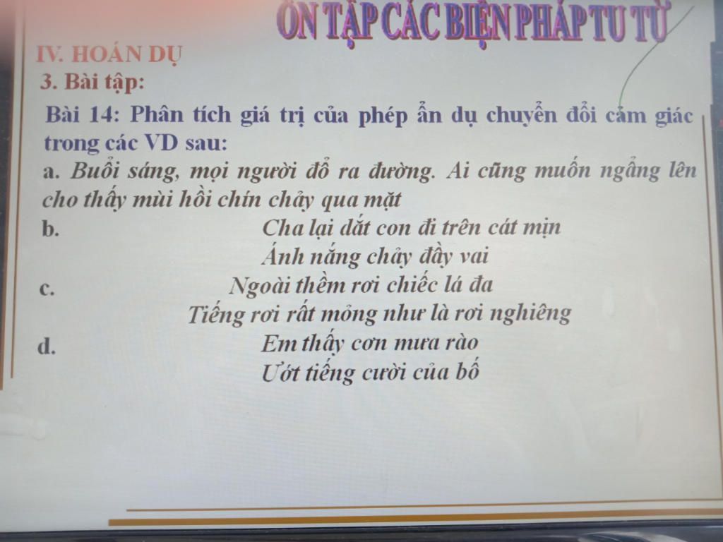 - Phép ẩn dụ chuyển đổi cảm giác được thể hiện qua từ " chảy". Bởi khi ngửi mùi hồi chín ta thường dùng mũi chứ không dùng cảm xúc bằng da thịt. Phép ẩn dụ chuyển đổi cảm giác trên khiến cho câu văn thêm sức hấp dẫn và gợi hình. Đồng thời,nó còn làm nổi bật lên mùi hương lôi cuốn của quả hồi khiến mọi người ai cũng phải ngước lên nhìn.