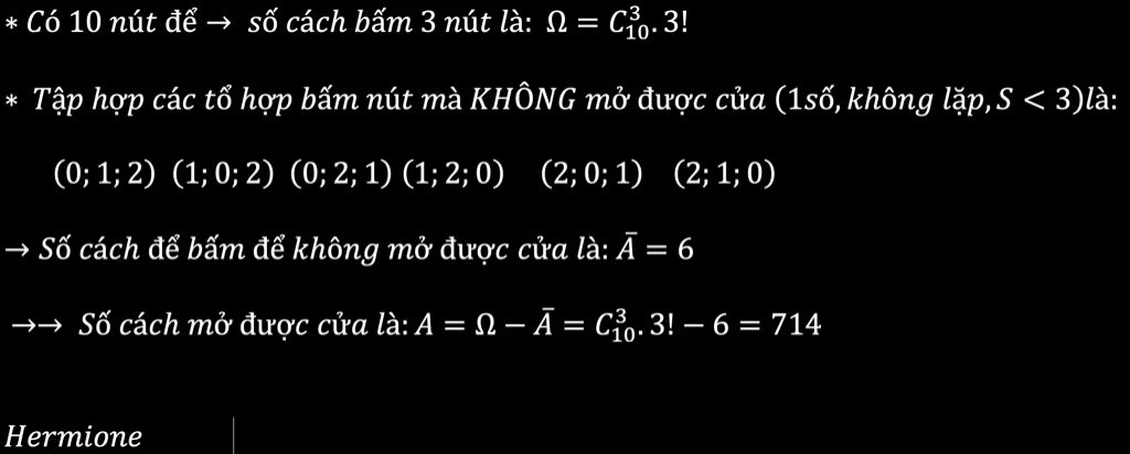 Một học sinh A thiết kế bảng điều khiển điện tử để mở cửa lớp mình. Bảng gồm 10 nút, mỗi nút được ghi số từ 0 đến 9 và không có 2 nút nào ghi cùng một số. Để mở cửa cần nhấn liên tiếp 3 nút khác nhau sao cho 3 số trên 3 nút đó theo thứ tự đã nhấn tạo thành 1 dãy số có tổng lớp hơn 3. Học sinh B chỉ biết muốn mở cửa phải bấm liên tiếp 3 nút. Hỏi có bao nhiêu cách để học sinh B có thể mở được cửa ?