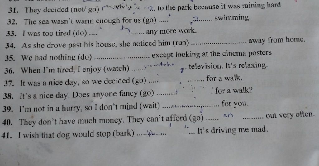 stop Ving: dừng hẳn việc j đó Dịch: Tôi ước con chó ngừng sủa. Nó làm tôi phát điên
